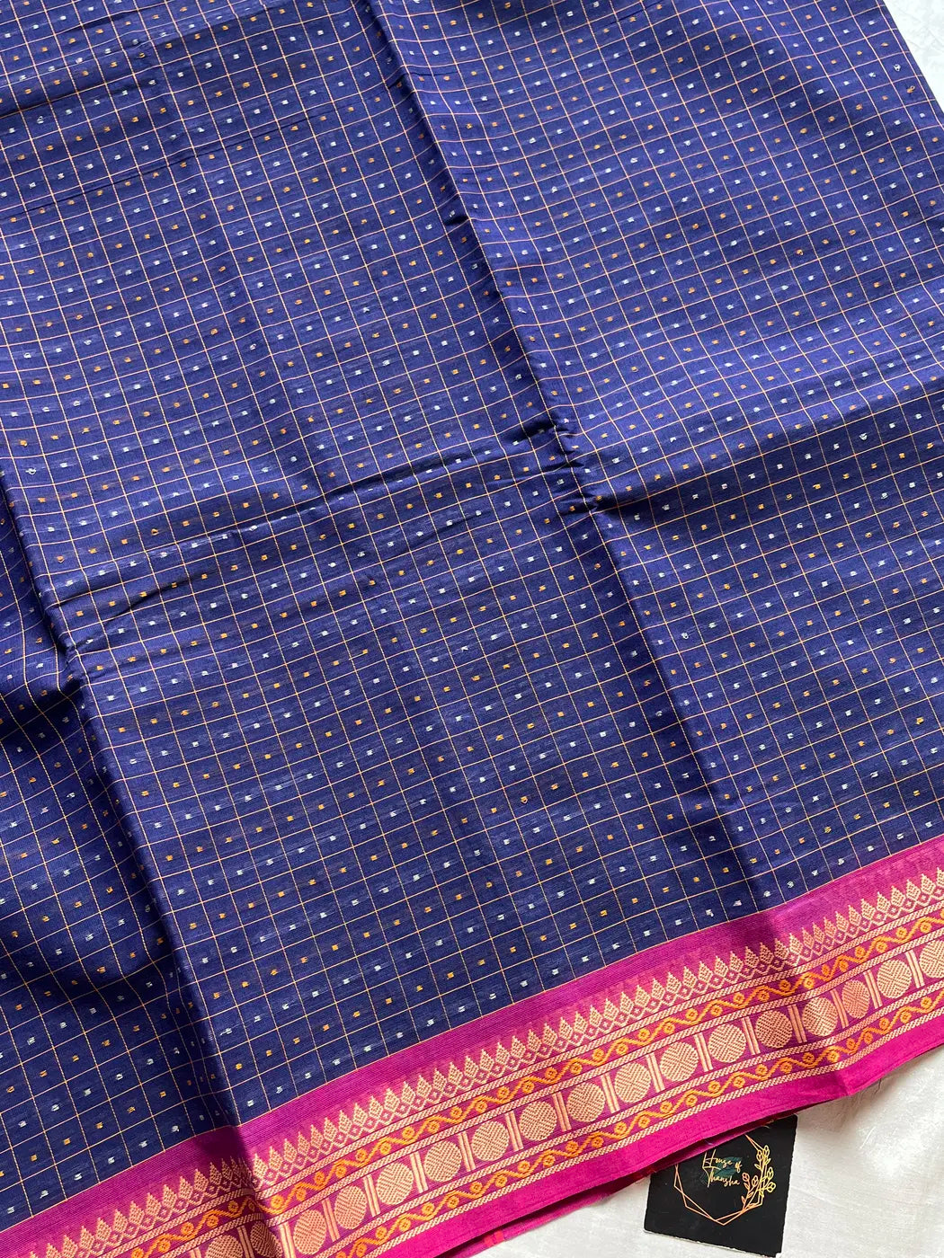 This Chettinadu cotton saree from our Mini Kattam series features fine checks woven in soft cotton, finished with a contrasting border. Lightweight and breathable, it’s crafted for everyday elegance with the charm of Chettinadu weaving.