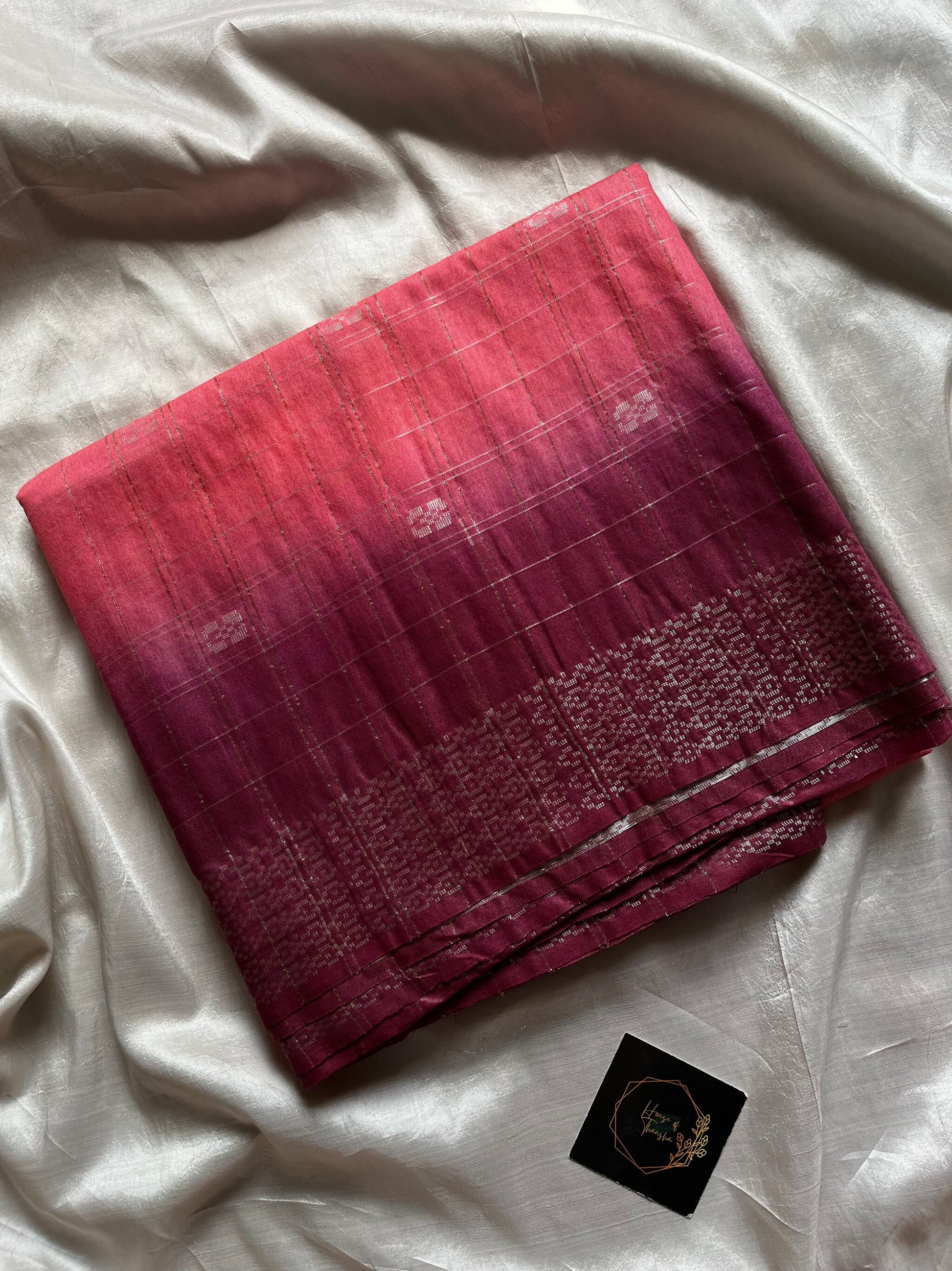 Vibrant orange crushed slub linen saree with pink contrast border, soft and lightweight.
