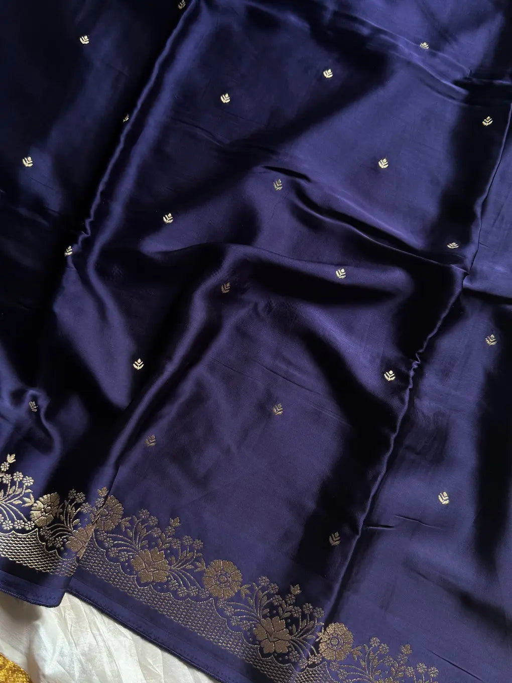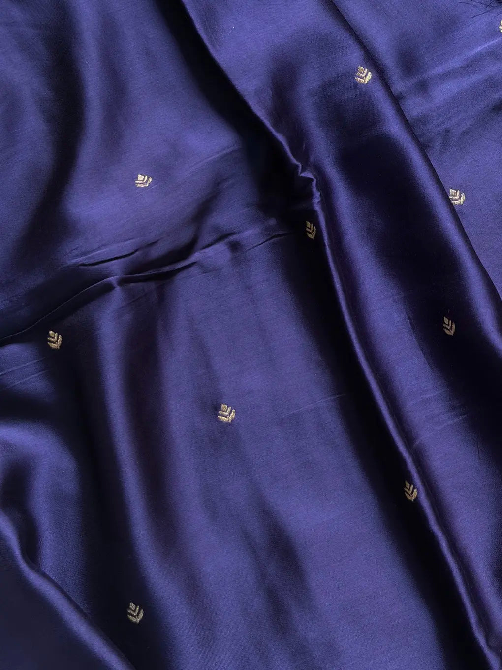 A timeless Banarasi Mashru Silk saree crafted in a deep royal blue tone, highlighted with elegant golden zari work throughout the body and pallu. The smooth mashru silk base gives a natural sheen, soft drape and luxurious finish.