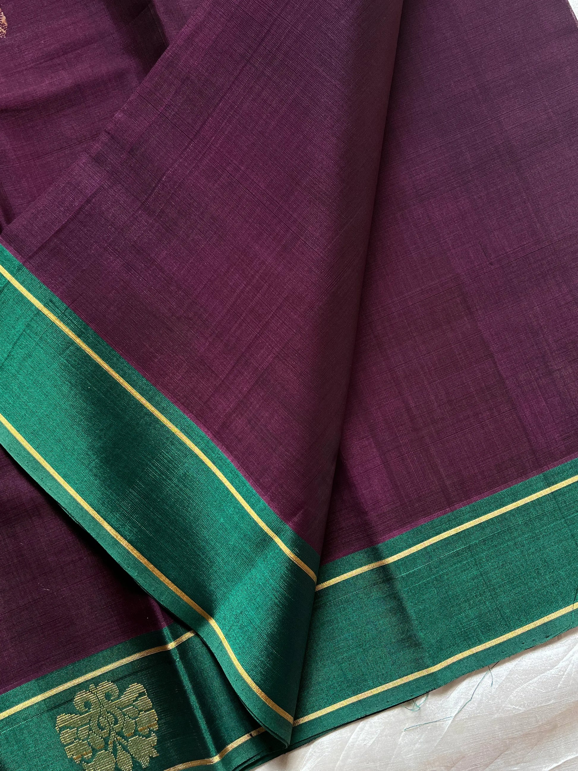 This handloom art silk saree features a rich purple body paired with a plain green border etched with subtle sari motifs. Its soft texture and graceful drape bring together quiet tradition and contemporary calm.