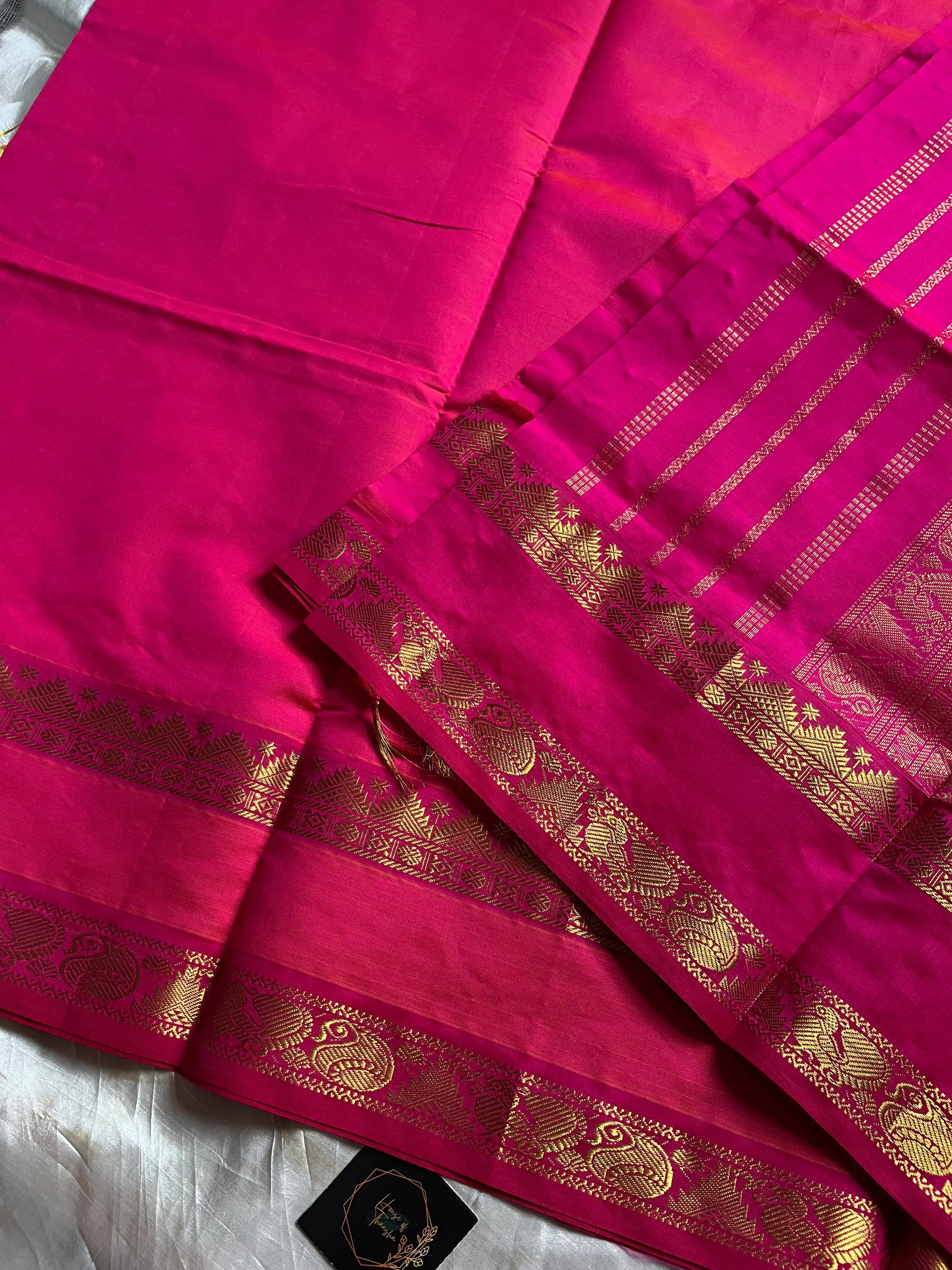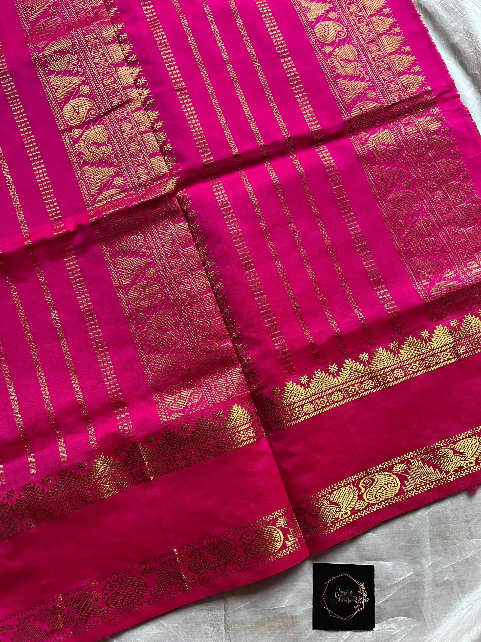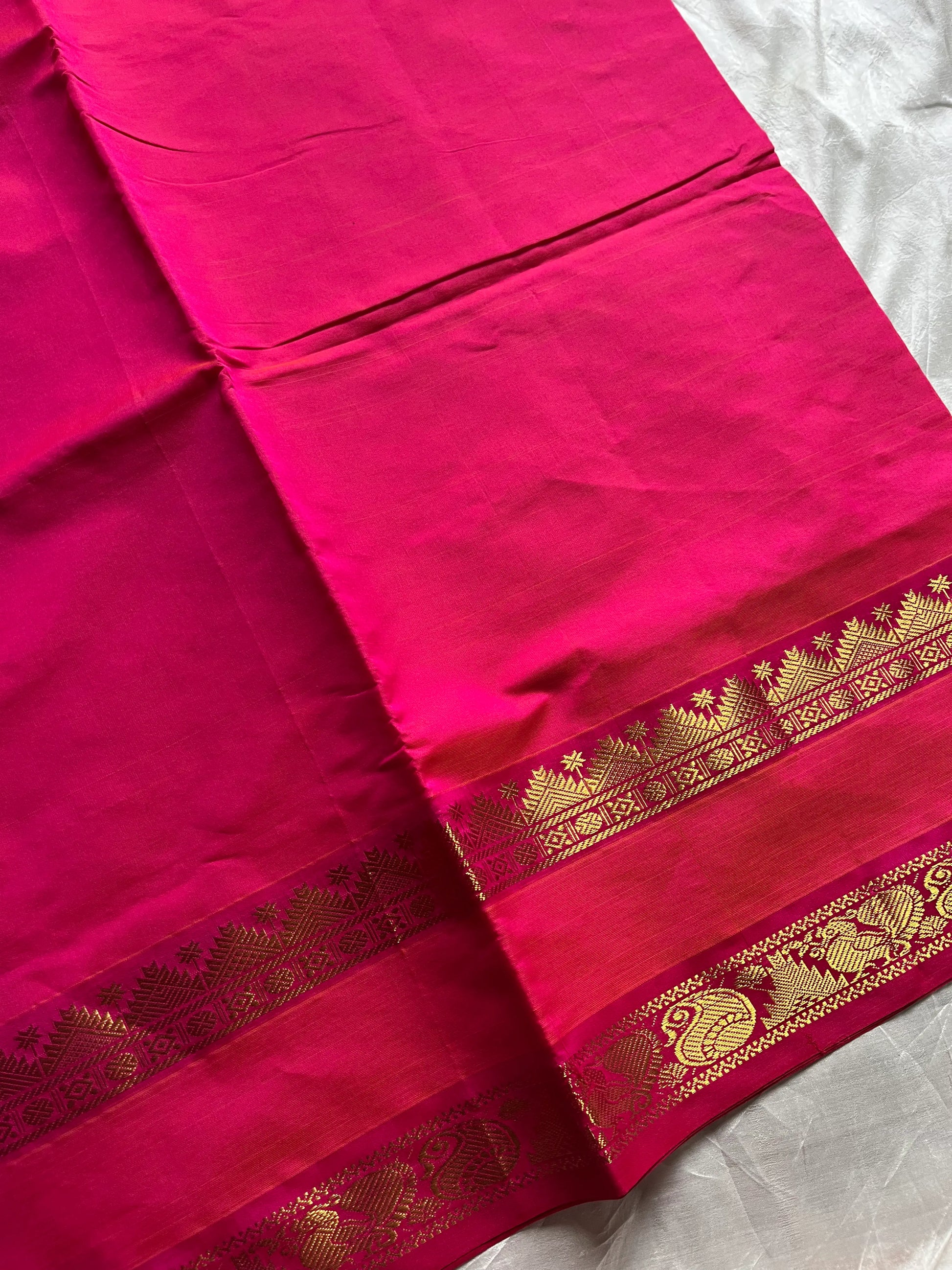Elegant handloom Kanchi silk cotton saree with handwoven rettai pettu borders. Light pink body with dark pink pallu and contrast blouse. Perfect for festive occasions.