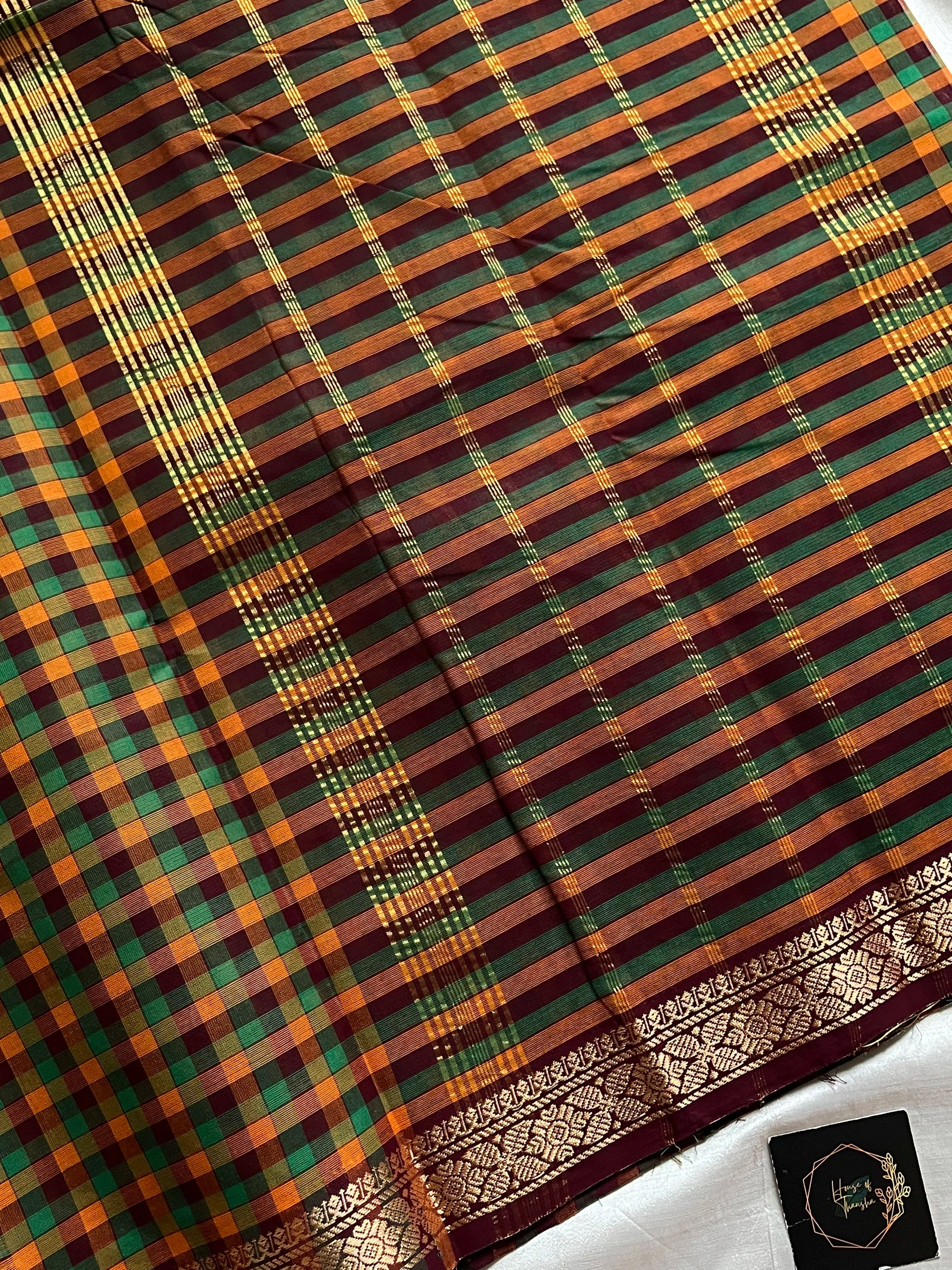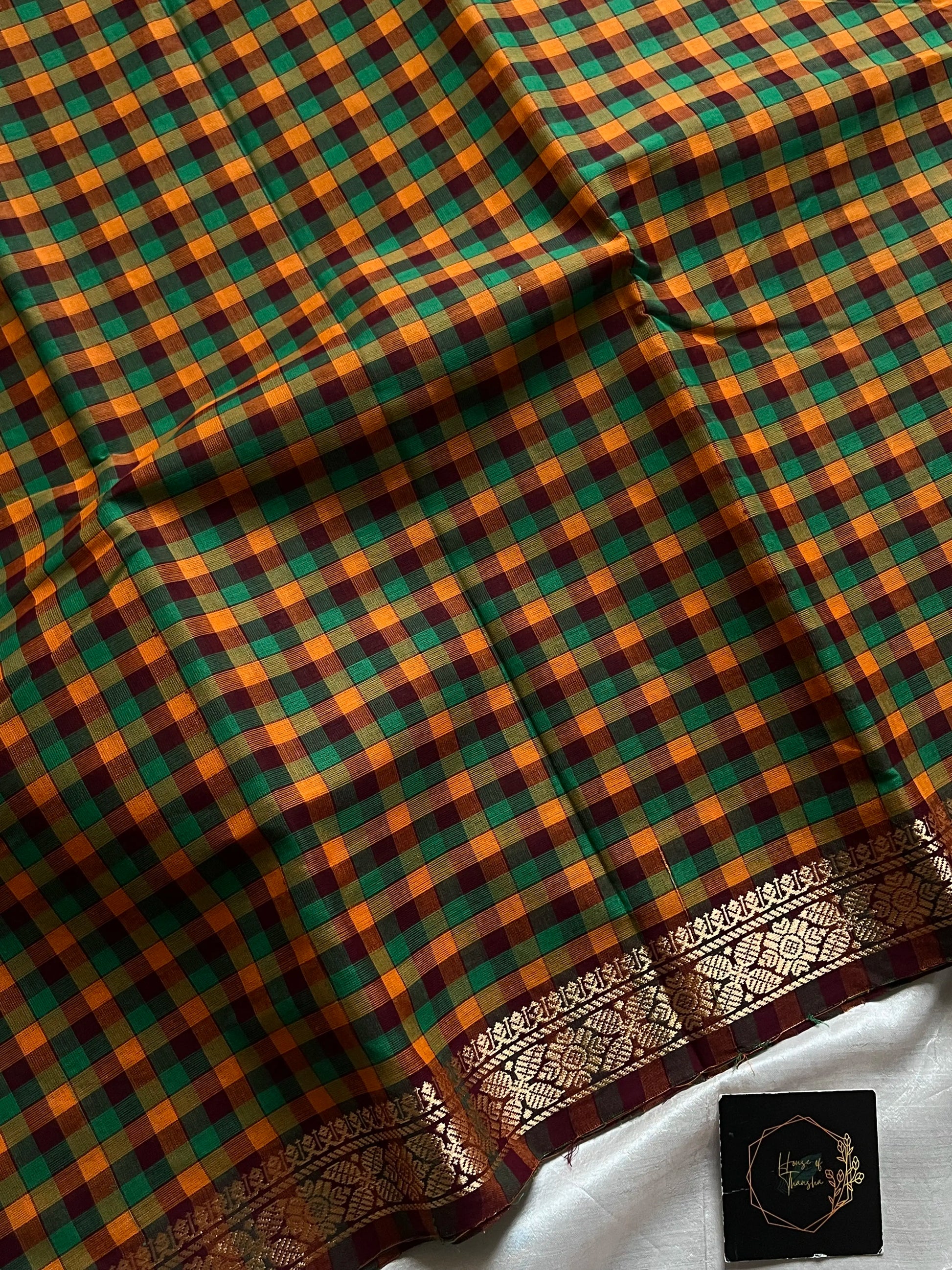 This Chettinadu cotton saree from our Mini Kattam series features fine multicoloured checks woven in soft cotton, finished with a contrasting brown border. Lightweight and breathable, it’s crafted for everyday elegance with the charm of Chettinadu weaving.