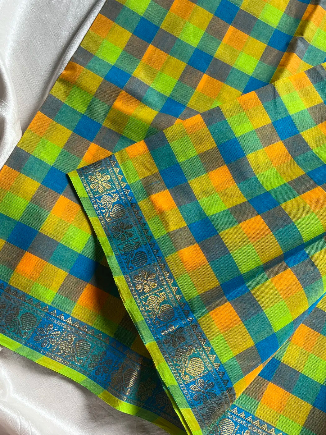 This Chettinadu cotton saree from our Mini Kattam series features fine multicoloured checks woven in soft cotton, finished with a contrasting border. Lightweight and breathable, it’s crafted for everyday elegance with the charm of Chettinadu weaving.