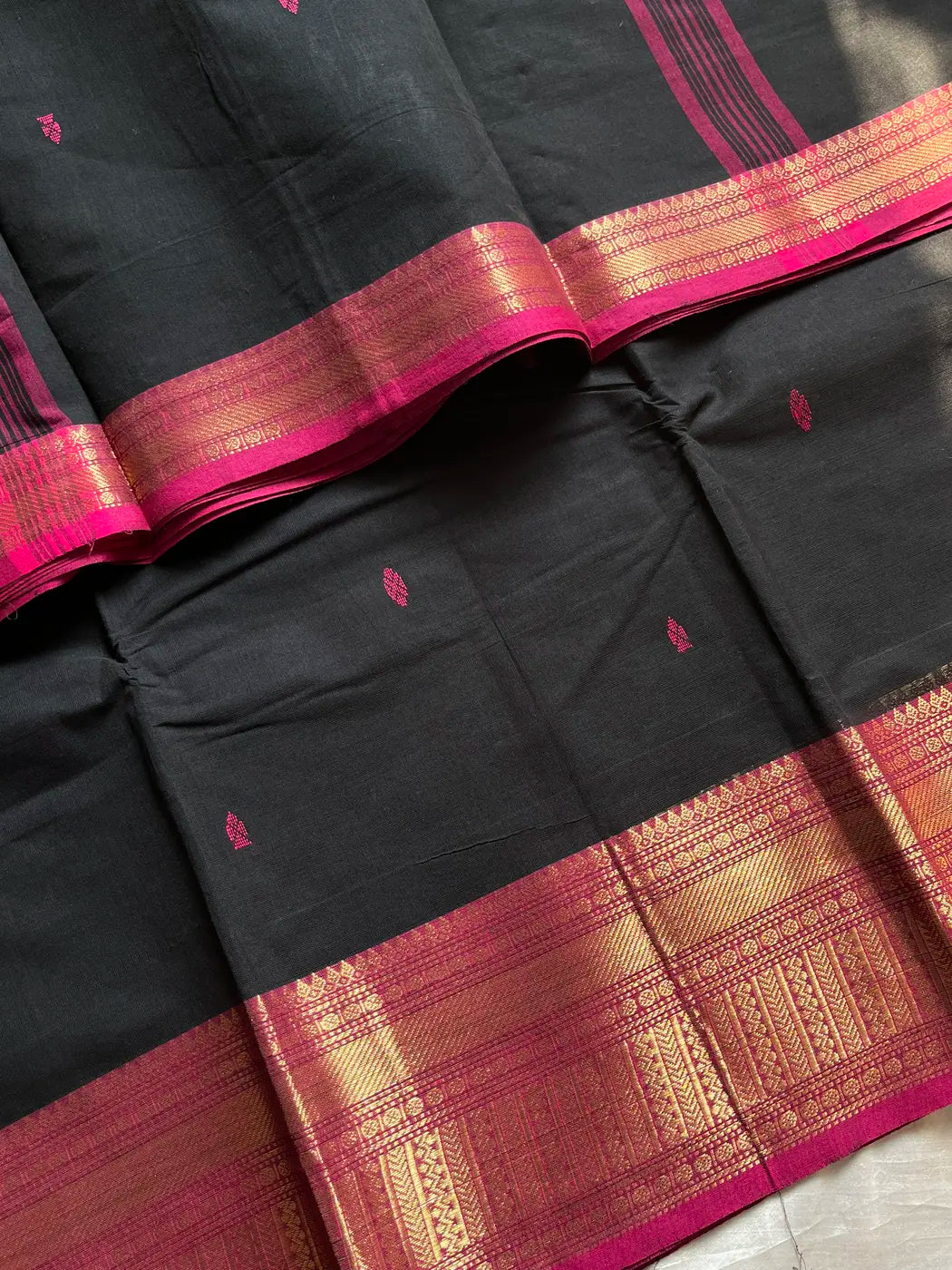 A black Chettinadu cotton saree with plain body and pink zari border. Comes with running blouse piece.