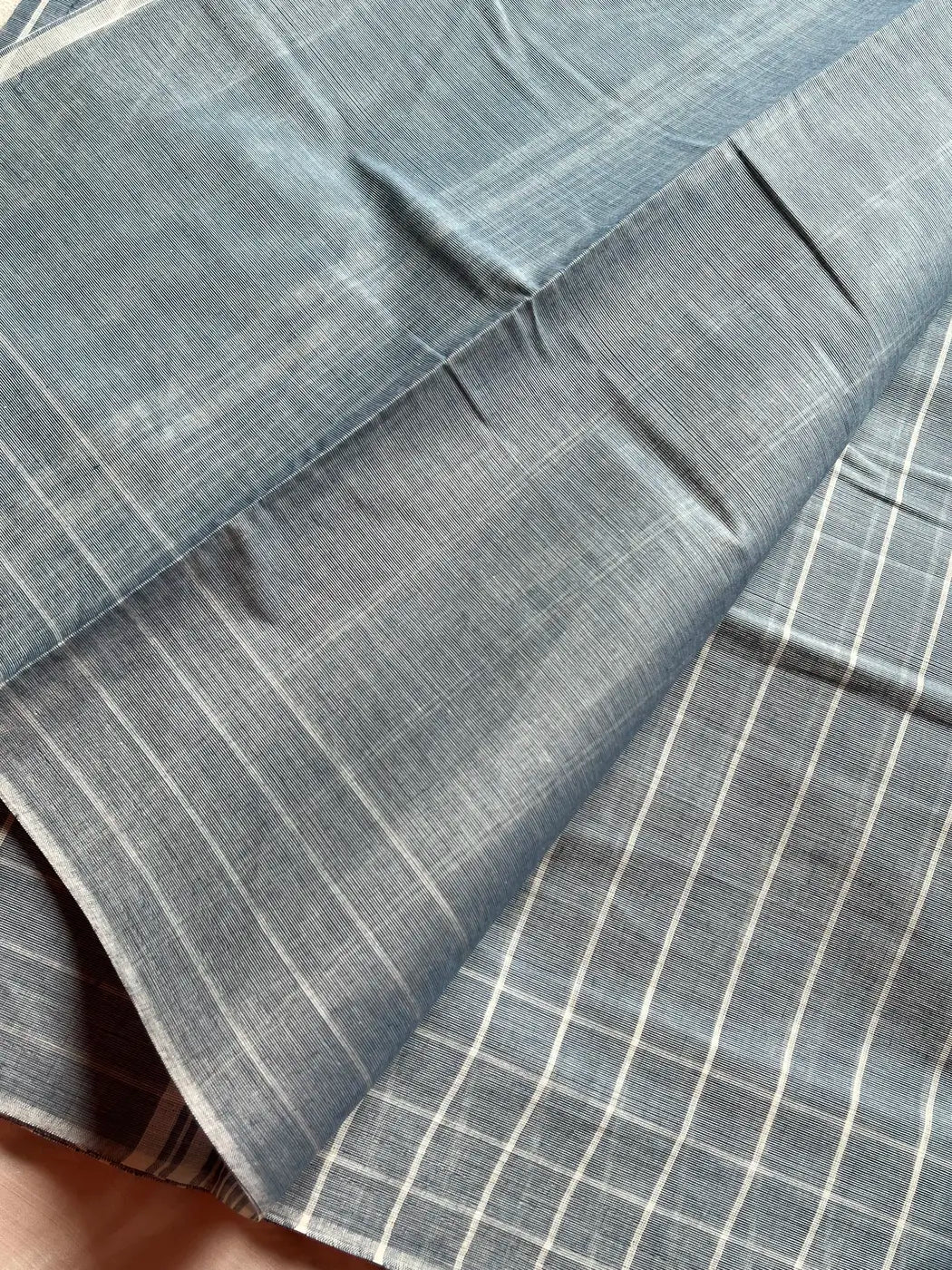 A Chettinadu cotton saree with stripes body and contrast blouse. Comes with running blouse piece and a extra contrast mulcotton blouse.