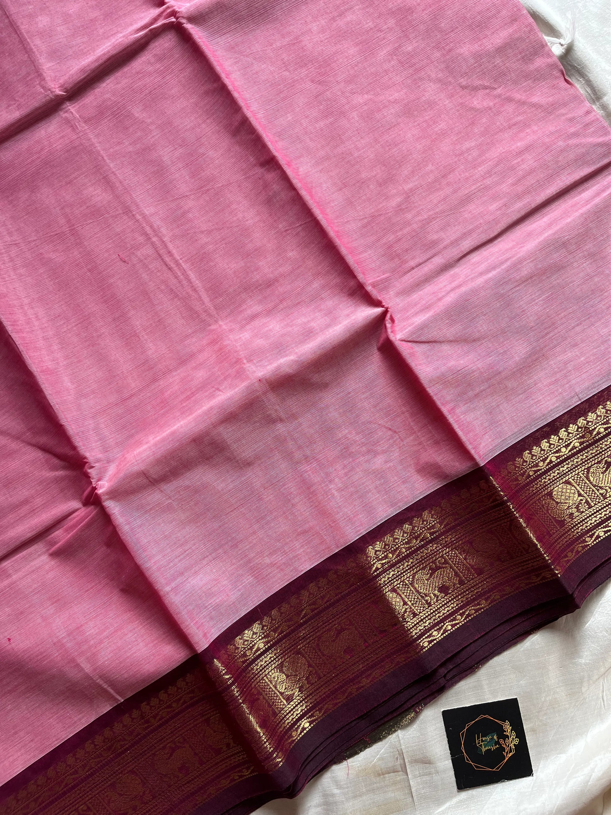 A pastel rose pink Chettinadu cotton saree with plain body and dark maroonish pink zari border. Comes with blouse piece. Length: 6.3 meters, height: 47-48 inches. Wash care: normal wash. Perfect for gifting or special occasions. Each saree features understated elegance and timeless weaving patterns. Thread pulls are natural and not considered damage.