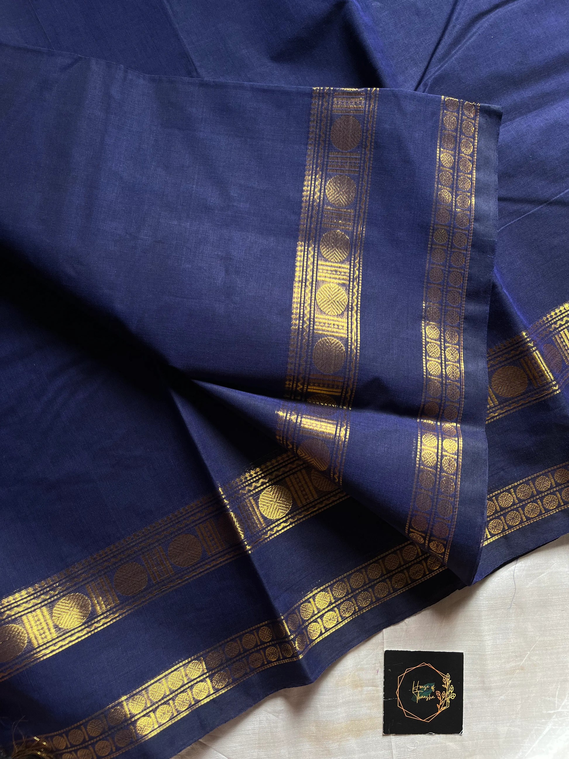A timeless Chettinadu cotton saree in a deep rich blue, woven in soft cotton for everyday elegance. Comes with a running blouse. Lightweight and comfortable, this saree is perfect for both casual wear and small occasions.