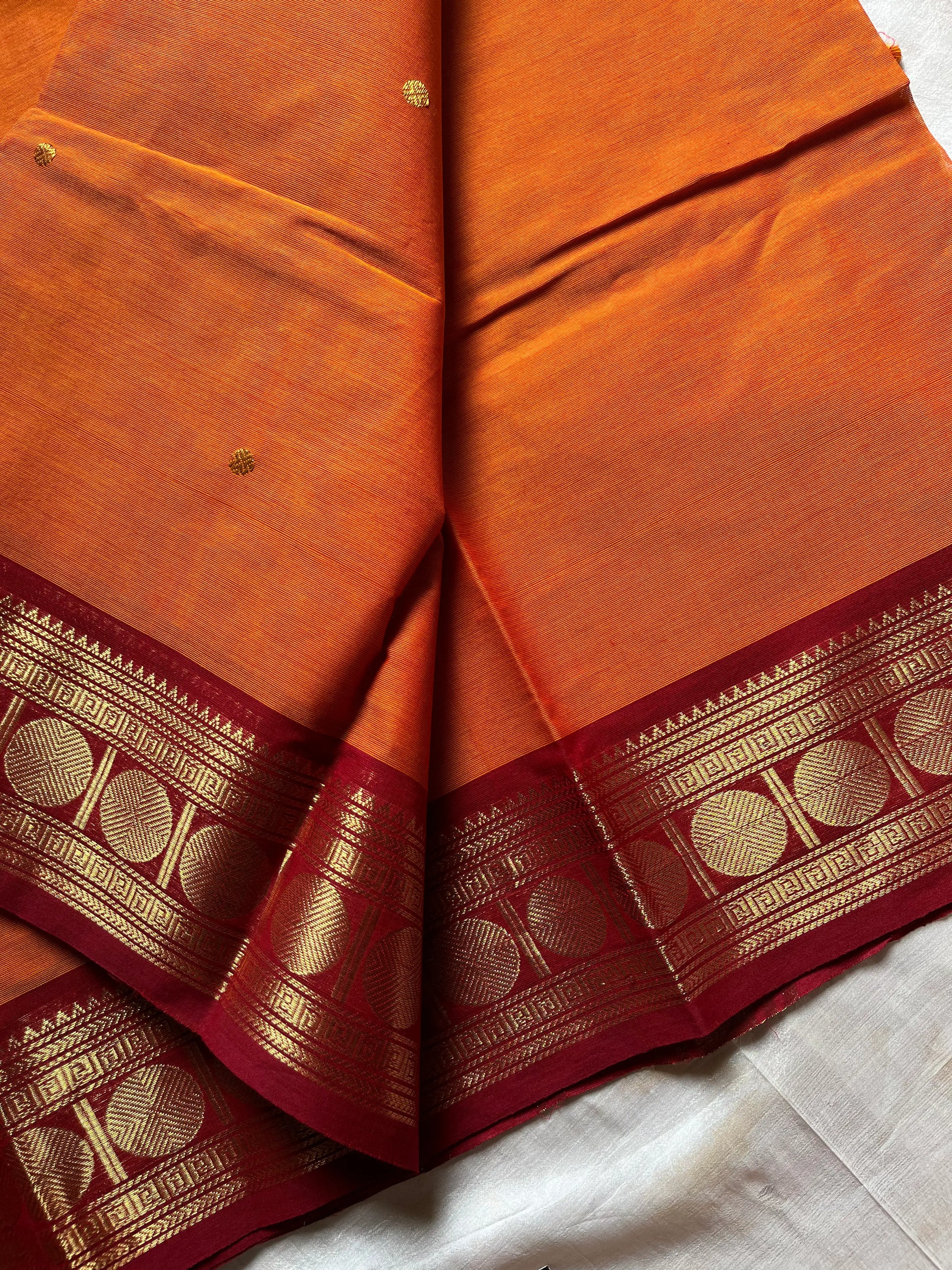 The deep orange shade carries sophistication, while the maroon border adds heritage charm — creating a drape that is both timeless and versatile. Crafted in breathable handloom cotton, it offers comfort and elegance for daily wear, festive gatherings, and traditional occasions.