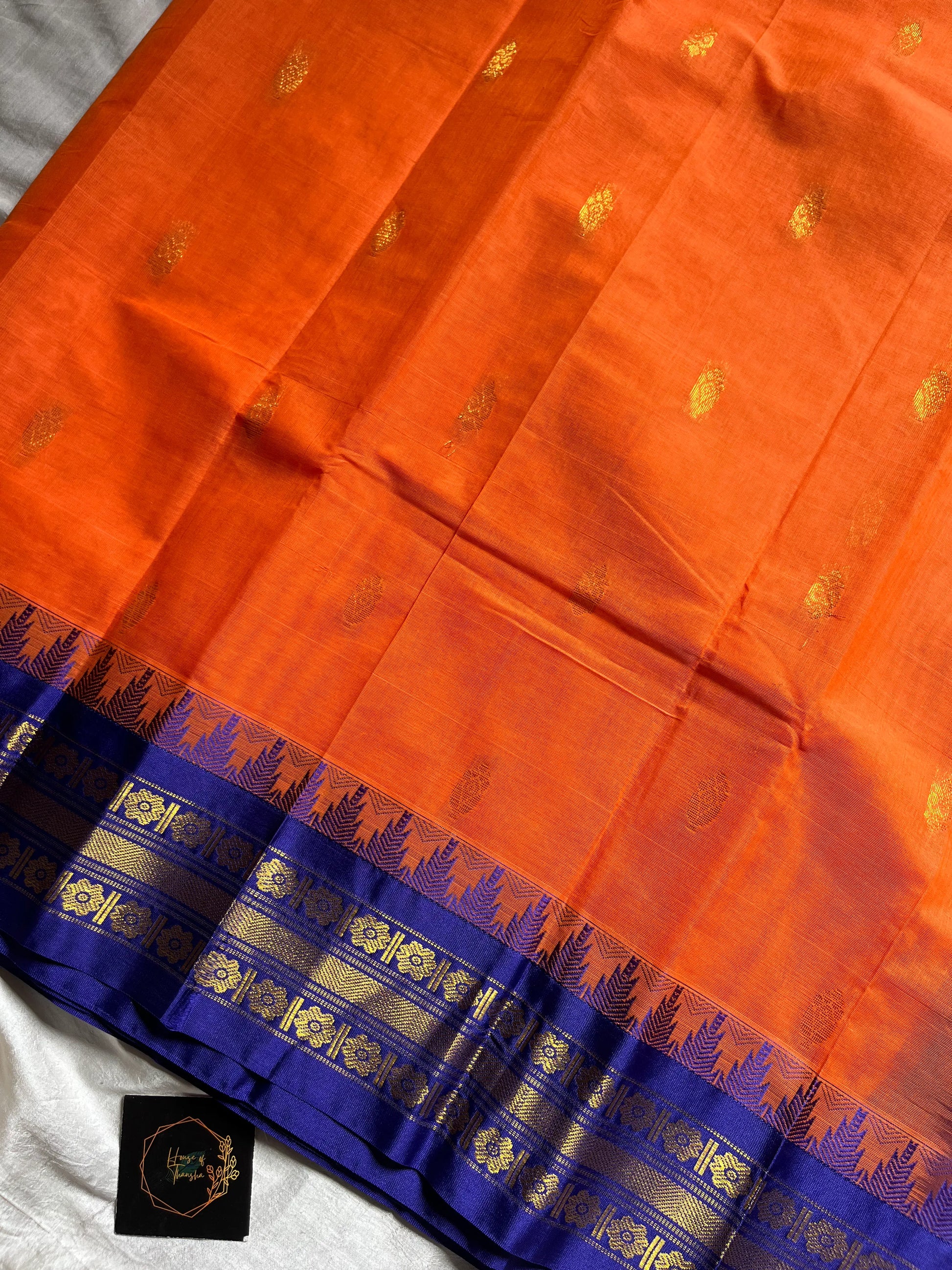 An orange semi-silk cotton saree with golden zari motifs across the body and a contrasting blue grand pallu. Comes with blouse piece. Length: 6.3 meters, height: 47–48 inches. Wash care: Dry clean. Each saree features timeless weaving patterns; thread pulls are natural and not considered damage.