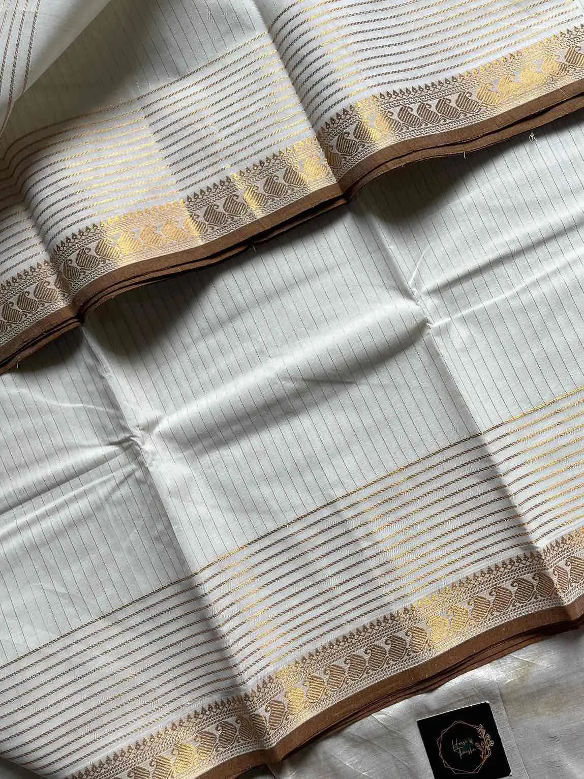 This White Kanchi cotton saree from our Zari Edition draws inspiration from classic kanchivaram silk weaves. Subtle golden zari stripes flow across the body, complemented by a small golden mango motif border that adds a graceful traditional accent. The zari-finished pallu completes the look with a touch of festive refinement.